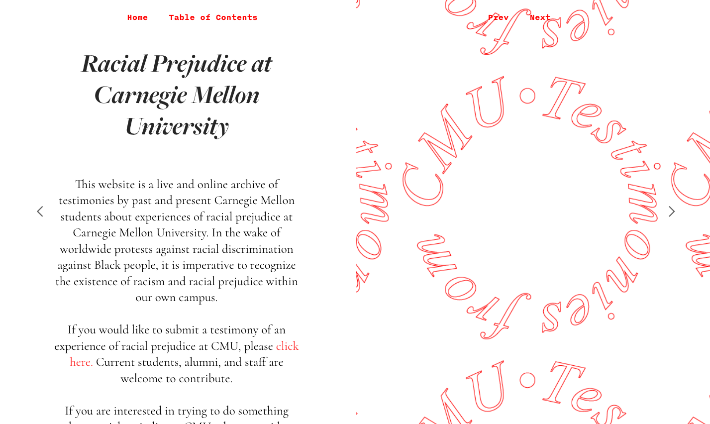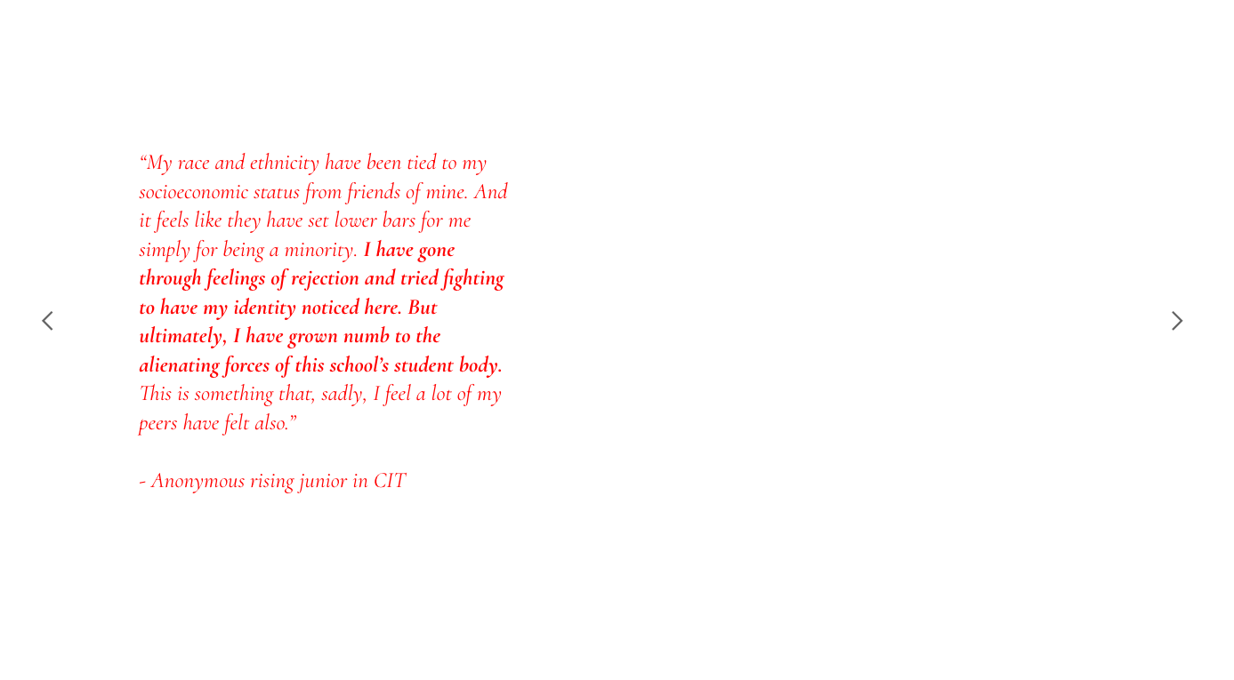 With the anti-racist uprisings in 2020 came a ripple effect that meant reckoning with the presence of systematic racism in every institution. With the ripple felt at Carnegie Mellon, I decided to try to create a platform for CMU affiliates to voice their own experiences of racial prejudice on campus.